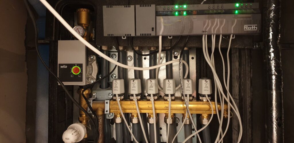Balofiks: Lige under den hvide “drejeknap” på fotoet findes nogle balofiks, som kan benyttes til helt at slukke for varme-systemet. Disse benyttes typisk aldrig og kan komme til at binde over tid, så når du alligevel er i teknikrummet eller måske 1 gang om året skal du lige lukke for dem og så er du velkommen til at åbne igen bare for at holde balofiksene i gang
