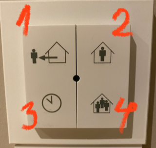 Hvis du f.eks. starter på knap 3 herover, så starter indblæsningen overalt og da det ellers ville give overtryk, startes udsugning fra badeværelserne samtidigt. Tilsvarende hvis du starter emhætten, starter indblæsningen som om du trykkede på knap 3 herover. Du kan ikke styre udsugningen fra badeværelserne direkte, men hvis du starter indblæsningen med f.eks. knap 3 eller 4 herover, så vil det automatisk starte udsugning fra badeværelserne og automatisk også slukke.