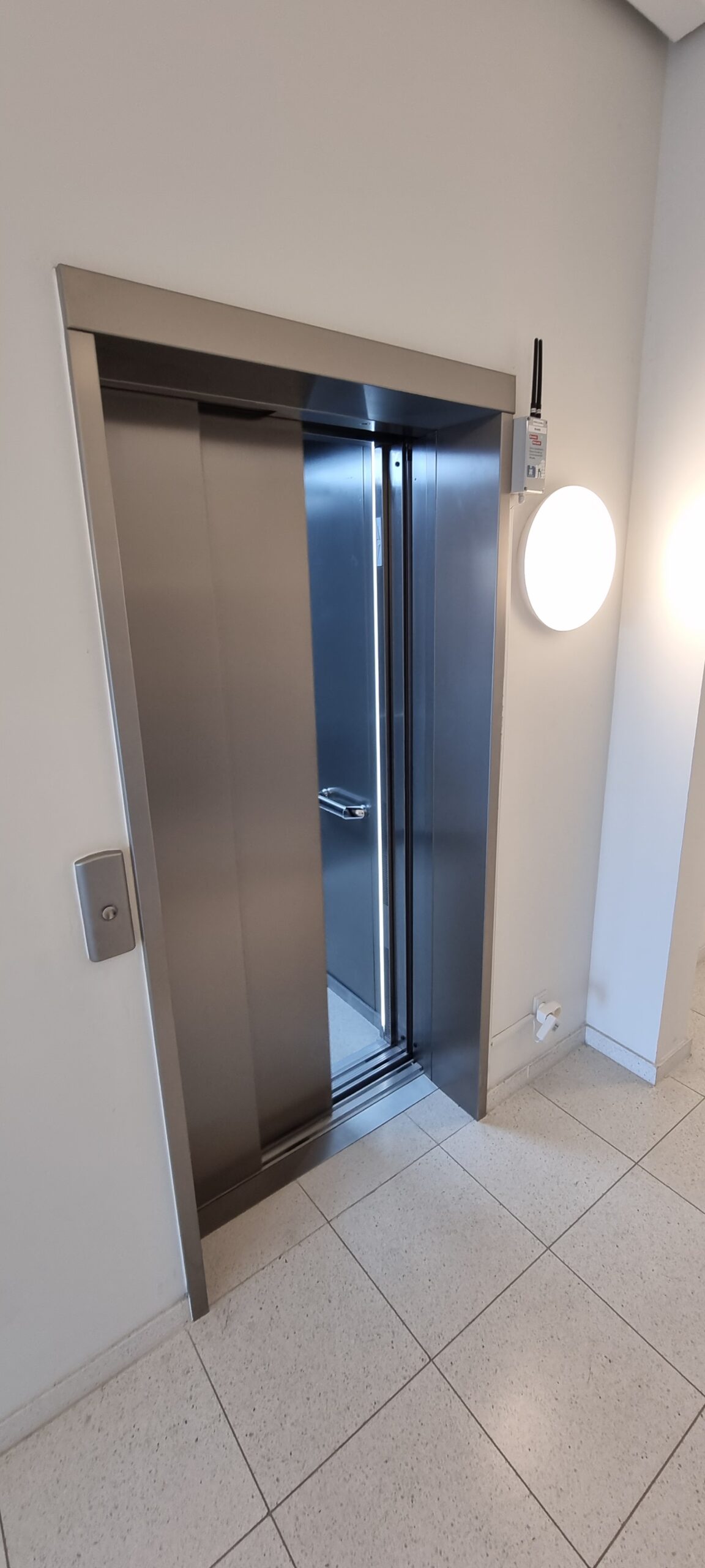 Herunder eksempel på aflæser i opgang 1 i stuen, hvor modtageren af data er monteret øverst i højre side af elevatordøren i stuen. Denne må IKKE slukkes, da der derved ikke længere aflæses data. I nogle opgange, hvor der ikke kunne opnåes tilstrækkelig forbindelse mellem senderen og målerne i teknikskabet, er der monteret sendere på flere etager. Lad venligst være med at slukke dem eller afmontere dem.
